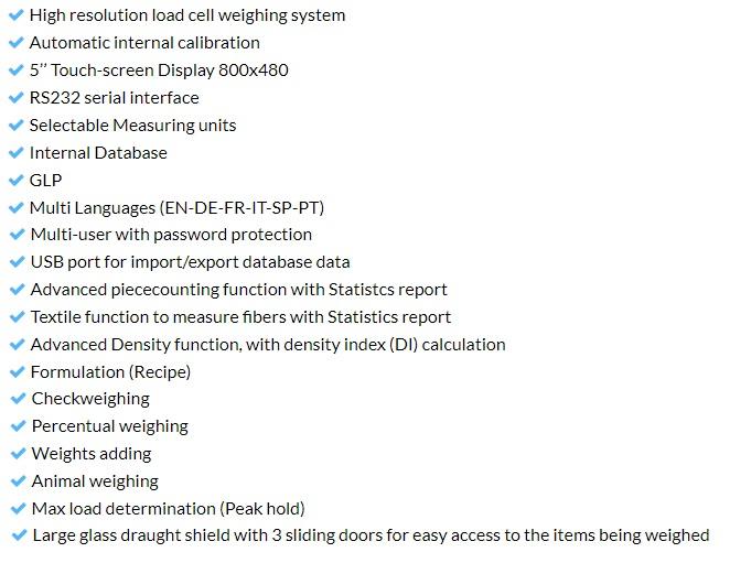 High Resolution Load CellTouchscreen Display Database Glp Setup Date&Time Formulation RS232 USB Measuring Units Piececounting Limits Percentual Weighing Totalization Animal Weighing Density Max Load Statistics Date&Time Multi Language
